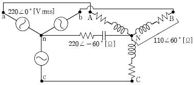 다음 Y-Y 결선 평형 3상 회로에서 부하 한 상에 공급되는 평균전력[W]은? (단, 극좌표의 크기는 실횻값이다)