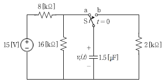 다음 회로에서 스위치 S가 단자 a에서 충분히 오랫동안 머물러 있다가 t=0에서 단자 a에서 단자 b로 이동하였다. t > 0일 때의 전압 vc(t) [V]는?