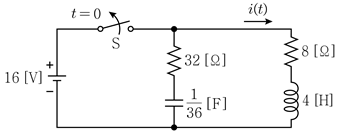 그림의 회로에서 스위치 S가 충분히 긴 시간 동안 닫혀 있다가 t=0에서 개방되었다. t>0 일 때의 전류 i(t)[A]는?