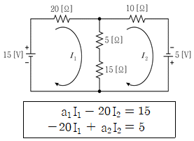 그림의 회로에서 전류 I1과 I2에 대한 방정식이 다음과 같을 때, a1+a2의 값은?