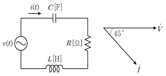 그림의 R-L-C 직렬회로에서 인가한 전원전압 v(t)와 전류 i(t)의 페이저도가 다음과 같을 때, 인덕턴스 L[H]은? (단, 전원전압의 주파수는 f[Hz]이다)