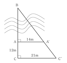 A, B 두 측점 간 거리를 측정할 때 장애물이 있어 그림과 같이 간접거리측량을 실시하였다. ∠BAA′=∠BCC′=90°이고, = 14m, = 12m, = 21m 일 때, AB의 거리[m]는?