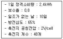 다음 조건과 같은 독립형 태양광발전용 축전지의 용량은 약 몇 Ah 인가?