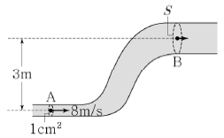 그림과 같이 단면적이 변하는 관을 따라 이상 유체가 흐르고 있다. 관 내부 두 지점 A, B의 압력은 같고, 높이 차는 3m이며, A에서 유체의 속력은 8m/s이다. A와 B의 단면적이 각각 1cm2, S 일 때, S의 값은? (단, 중력 가속도 g=10m/s2로 한다.)