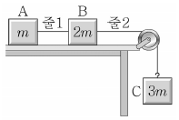 그림은 물체 A, B, C에 줄1, 2를 연결하고 C를 잡고 있다가 가만히 놓았을 때 세 물체가 등가속도 직선 운동하는 것을 나타낸 것이다. A, B, C의 질량은 각각 m, 2m, 3m이고, A와 B는 수평한 책상면 위에서 운동한다. 이에 대한 설명으로 가장 옳은 것은? (단, 중력 가속도는 g이고, 줄의 질량 및 모든 마찰과 공기 저항은 무시한다.)