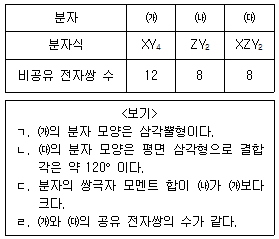 표는 2주기 원소 X~Z로 이루어진 분자 ㈎~㈐에 대한 자료이다. ㈎~㈐에서 모든 원자가 옥텟 규칙을 만족할 때, 이에 대한 설명으로 옳은 것만을 <보기>에서 모두 고른 것은? (단, X~Z는 임의의 원소 기호이다.)