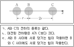 <보기 1>과 같이 점전하 B를 x축 위에 고정된 점전하 A, C로부터 거리가 각각 r, 2r인 지점에 놓았더니 B가 정지해 있었다. 이에 대한 설명으로 옳은 것을 <보기 2>에서 모두 고른 것은?