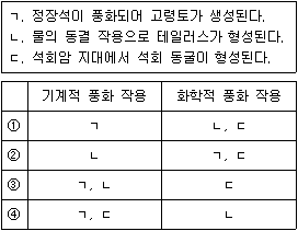 <보기>의 ㄱ, ㄴ, ㄷ은 여러 가지 풍화 작용의 예를 나타낸 것이다. ㄱ, ㄴ, ㄷ을 기계적 풍화 작용과 화학적 풍화 작용으로 가장 옳게 구분한 것은?