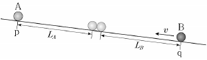 <보기>와 같이 기울기가 일정하고 마찰이 없는 경사면에서 시간 t=O일 때 점 p에 물체 A를 가만히 놓는 순간, 물체 B가 v의 속력으로 경사면의 점 q를 통과하였다. 동일한 직선 경로를 따라 운동하는 A, B는 각각 LA, LB만큼 이동하여 t0초 후 같은 속력으로 충돌하였다. 이때 LA:LB는?