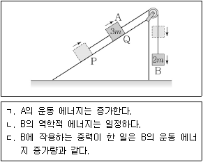 <보기 1>은 물체 A와 물체 B가 실로 연결된 채 정지한 상태에서 운동을 시작하여 경사면을 따라 등가속도 운동을 하는 모습을 나타낸 것이다. A, B의 질량은 각각 3m, 2m이다. A가 P에서 Q까지 이동하는 동안, 나타나는 현상에 대한 설명으로 옳은 것을 <보기 2>에서 모두 고른 것은? (단, 실의 질량과 모든 마찰은 무시한다.)