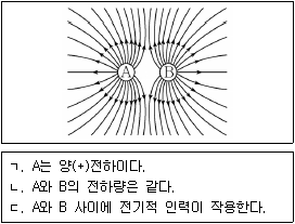 <보기 1>은 고정되어 있는 두 점전하 A, B 주위의 전기력선을 나타낸 것이다. 이에 대한 설명으로 옳은 것을 <보기 2>에서 모두 고른 것은?