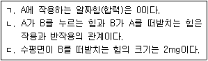 그림은 수평면에 놓인 물체 B 위에 물체 A를 올려놓은 것을 나타낸 것이다. A, B의 질량은 각각 m, 2m이고, A와 B는 정지한 상태이다. 이에 대한 설명으로 옳은 것을 <보기>에서 모두 고른 것은? (단, 중력 가속도는 g이다.)