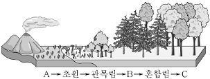 그림은 식물 군집의 건성 천이 과정을 나타낸 것이다. 이에 대한 설명으로 옳은 것은?