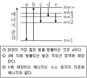 그림은 수소 원자의 전자 전이를 나타낸 것이다. 전자 전이 a~e에 대한 설명으로 옳은 것을 <보기> 에서 모두 고른 것은? (단, 수소 원자의 에너지 준위는 En=-1312/n2kJ/몰이다.)