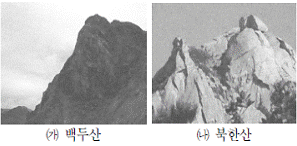 그림 ㈎와 ㈏는 백두산과 북한산의 한 봉우리를 나타낸 것이다. 이에 대한 설명으로 옳은 것은?
