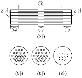 그림 ㈎는 근육 원섬유 마디를, 그림 ㈏~㈑는 근육 원섬유 마디의 서로 다른 세 지점의 단면에서 관찰되는 액틴 필라멘트와 마이오신 필라멘트를 나타낸 것이다. 이에 대한 설명으로 옳은 것은?(단, ㉠은 암대이다.)