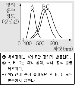 그래프는 색을 감지하는 사람의 원뿔 세포 A, B, C가 파장에 따라 빛을 흡수하는 정도를 나타낸 것이다. 이에 대한 설명으로 옳은 것을 <보기>에서 모두 고른 것은?