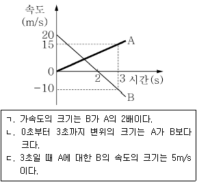 그림은 같은 직선 위에서 운동하는 물체 A, B의 속도를 시간에 따라 나타낸 것이다. 이에 대한 설명으로 옳은 것을 <보기>에서 모두 고르면?