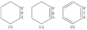 그림은 고리 모양 탄화수소 ㈎~㈐의 구조식을 나타낸 것이다. 이에 대한 설명으로 옳지 않은 것은? (단, a~c는 탄소 원자 사이의 결합 길이이다.)