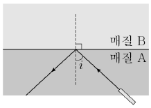 그림은 빛이 매질 A, B의 경계면에 입사각 i로 입사하여 전반사하는 모습을 나타낸 것이다. 이에 대한 설명으로 옳은 것은?