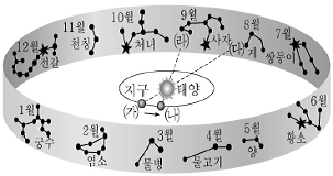 그림은 지구의 공전 궤도와 황도 12궁을 나타낸 것이다. 이에 대한 설명으로 옳은 것은?