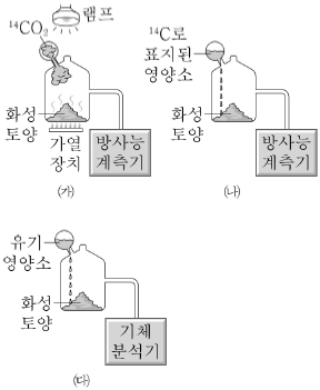 그림은 화성에 생명체가 존재하는지 알아보기 위한 실험을 나타낸 것이다. 이에 대한 설명으로 옳은 것은?