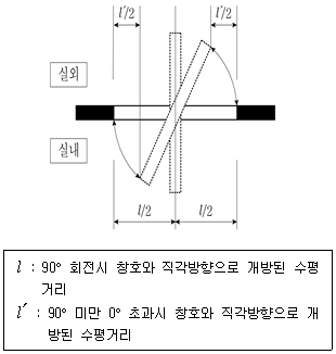 「건축물의 설비기준 등에 관한 규칙」상 다음 창호 평면에 나타난 피벗(pivot) 종축창의 배연창 유효면적 산정기준은? (단, W는 창의 폭, H는 창의 유효 높이이다)
