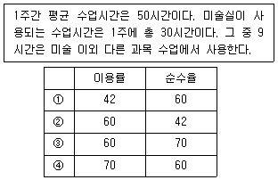 다음과 같은 조건을 가진 어떤 학교 미술실의 이용률[%]과 순수율[%]은?
