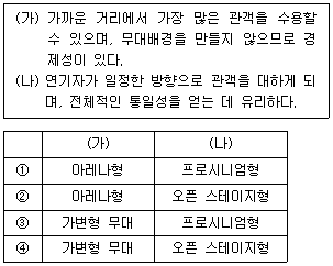 다음은 공연장의 평면형식에 대한 설명이다. (가), (나)에 해당하는 내용을 바르게 연결한 것은?