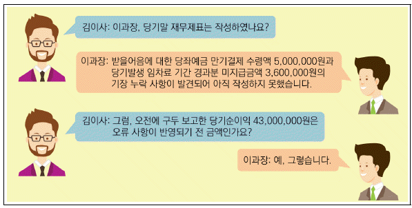 다음은 (주)한공의 결산 관련 대화이다. 이를 근거로 계산한 수정 후 당기순이익은 얼마인가?