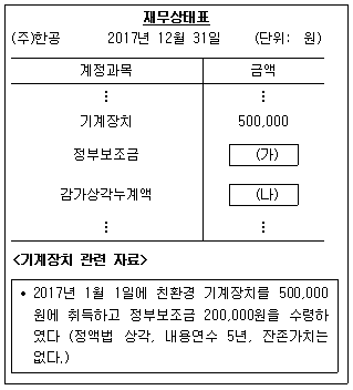 다음은 (주)한공의 2017년 기계장치 관련 자료와 재무상태표의 일부이다. (가)와 (나)에 들어갈 금액으로 옳은 것은? (순서대로 (가), (나))