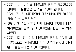 다음은 (주)한공의 매출채권 대손 관련 자료이다. 2021년 기말 매출채권 잔액은 얼마인가?