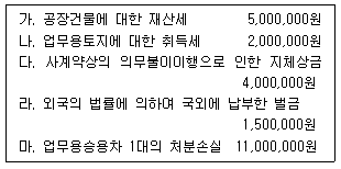 다음은 제조업을 영위하는 (주)한공의 손익계산서상 세금과공과 계정의 내역이다. 각 사업연도 소득금액을 계산할 때 손금불산입으로 세무조정하여야 할 총액은 얼마인가? (단, 사업연도 월수는 12개월이다.)