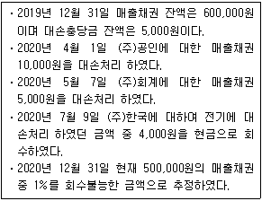 다음은 (주)한공의 매출채권 대손 관련 자료이다. 2020년 손익계산서에 반영될 대손상각비는 얼마인가?