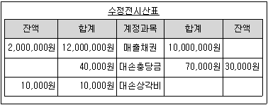 다음은 (주)한공의 당기 말 수정전시산표의 일부이다. 당기에 회수한 현금은 얼마인가? (단, 전기 말 매출채권은 1,000,000원, 대손충당금은 40,000원이다.)