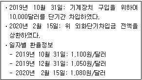 다음은 (주)한공의 외화거래 관련 자료이다. 2019년 말 결산 시 외화환산손익과 2020년 외화차입금 상환 시 외환차손익은 각각 얼마인가?