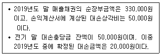 다음 자료를 토대로 (주)한공의 2019년도 재무상태표에 보고될 대손충당금 차감전 매출채권금액을 계산하면 얼마인가?