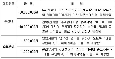 다음은 해상운송업을 영위하는 (주)한공의 제15기(2019.1.1. ~ 2019.12.31.) 손익계산서상 수선비 및 소모품비 계정의 내역이다. 법인세법상 즉시상각의제 규정에 따라 감가상각한 것으로 보아야 하는 금액은?