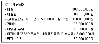 다음은 개인사업을 영위하는 김한공 씨의 2019년도 손익계산서이다. 이를 토대로 2019년도 사업소득금액을 계산하면 얼마인가? (단, 2019년 중 부채의 합계가 자산의 합계액을 초과하지 않았고, 소득세비용은 고려하지 않는다.)