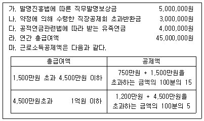 다음 자료를 토대로 거주자 김한공 씨의 2019년 귀속 종합소득금액은 계산하면 얼마인가? (단, 모든 소득은 국내에서 발생한 것으로 세법에 따라 적법하게 원천징수 되었으며 필요경비는 확인되지 않는다.)