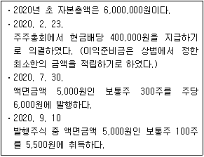 다음은 (주)한공의 자본거래 관련 자료이다. 이를 토대로 2020년 말 (주)한공의 자본총액을 계산하면 얼마인가?