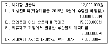 다음 자료를 토대로 (주)한공(의류제조업)의 2019년 제1기 확정신고 시 부가가치세 과세표준을 계산하면 얼마인가?(단, 주어진 자료에는 부가가치세가 포함되지 아니하였다.)