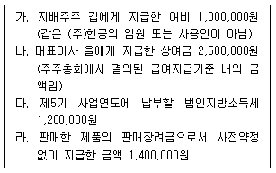 다음은 제조업을 영위하는 내국법인인 (주)한공이 제5기 사업연도(2016.1.1.∼ 2016.12.31.)에 계상한 비용이다. 각 사업연도 소득금액 계산 시 손금에 산입되지 아니하는 금액을 구하면 얼마인가?