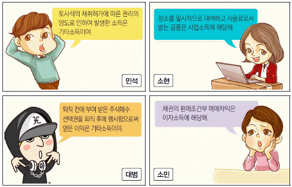 다음 중 소득세법상 소득구분에 대한 설명을 틀리게 하고 있는 사람은?