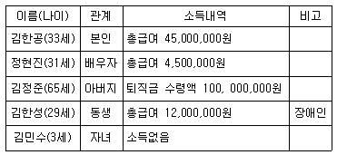 다음은 2017년말 현재 거주자인 김한공씨와 생계를 같이하는 사람들이다. 김한공씨가 2017년도 소득세 신고시 적용받을 수 있는 기본공제대상자는?