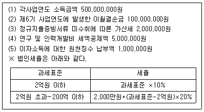 다음은 중소기업인 (주)한공의 제7기(2017.1.1.~2017.12.31.)에 대한 세무자료이다. 법인세 자진납부할 세액은 얼마인가? (단, 분납은 신청하지 않는 것으로 한다)