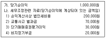 다음은 (주)한공의 제15기(2018.1.1.~2018.12.31.) 사업연도의 법인세 신고를 위한 자료이다. 법인세법상 각 사업연도소득금액은 얼마인가?