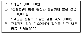 다음의 거주자 김한공 씨의 기타소득 내역 중 필요경비가 최소한 100분의 80에 해당하는 항목들의 합계액은 얼마인가?