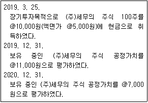 다음은 (주)한공의 주식거래 관련 자료이다. 2020년도 결산 시 재무상태표에 계상될 매도가능증권평가손익은 얼마인가?