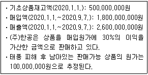 (주)한공은 2020년 9월 7일 태풍으로 인해 상품이 소실되는 피해를 입었다. 다음 자료에 의해 재해손실로 인식할 상품 피해액을 추정하면 얼마인가?